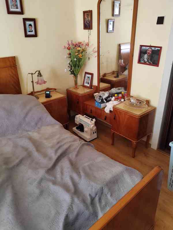Prodám původní předvalečnou ložnici. Skříně na šaty, manželske postele, noční stolky, toaleta.