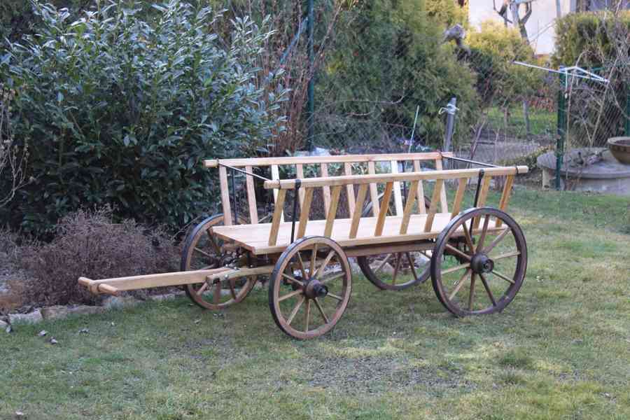 Prodám starý dřevěný žebřiňák po opravě, vhodný především jako dekorace, případně pro lehké využití za poníka. Celková délka je cca 160 cm včetně oje. Žebřiňák prošel opravou, konstrukce je pevná, dřevo je zdravé a ošetřené. Kola jsou původní s kovovými obručemi, zachovalá a plně funkční.
