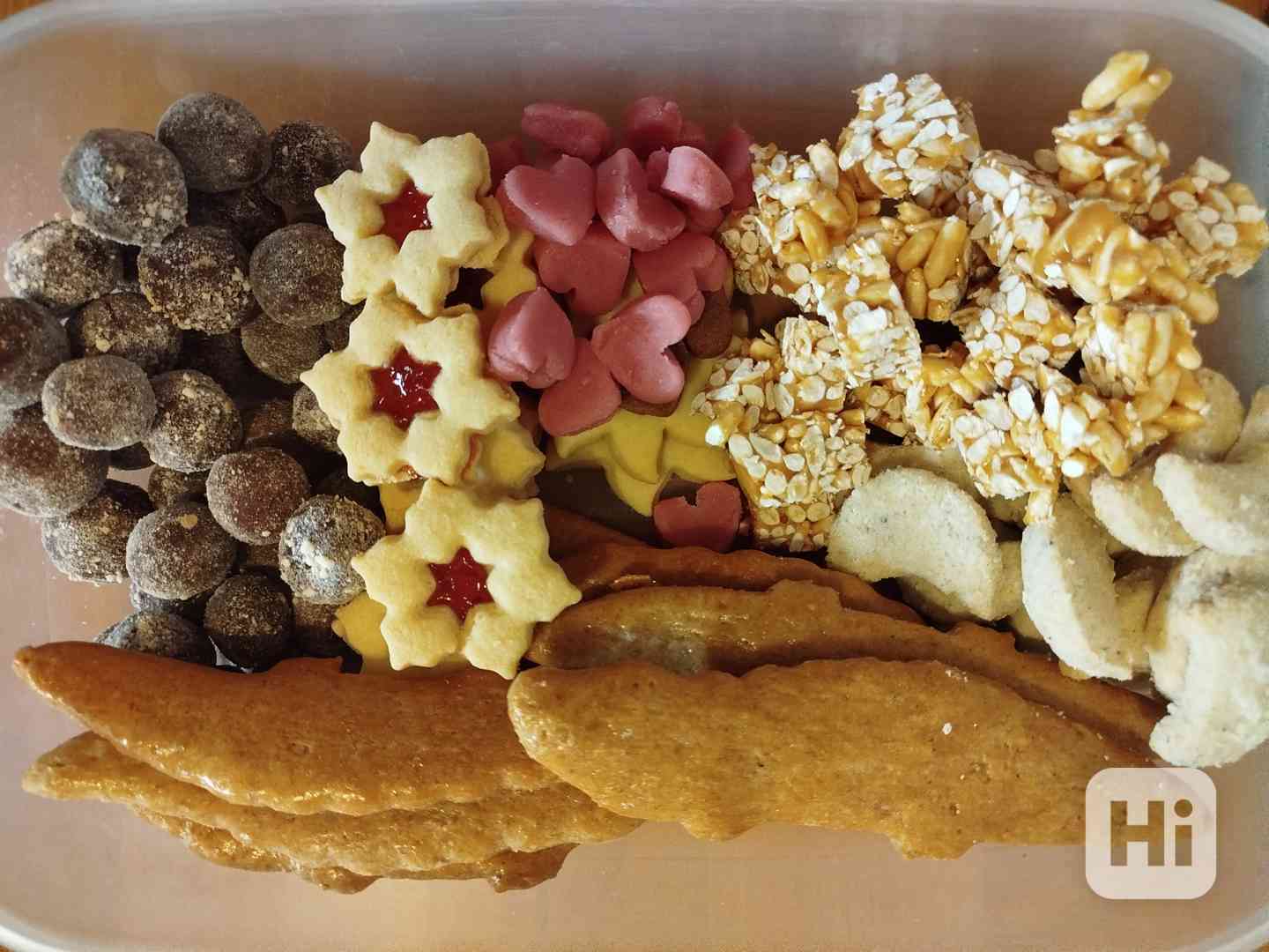 Rumové kuličky, linecké s jahodovou, marcipán, burizony v karamelu, rohlíčky (půlměsíce) a perníčky. Z kvalitního másla. Jen předání v Brně.