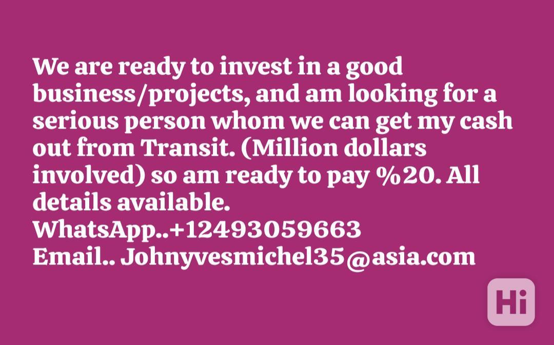 Jsme připraveni investovat do dobrého podnikání/projektů a hledáme seriózního člověka, od kterého bychom mohli dostat peníze z Transitu. (Jde o miliony), takže jsem připraven zaplatit 20 %. Veškeré podrobnosti k dispozici.