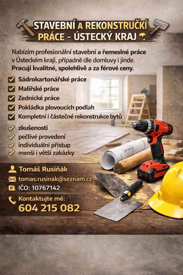 Nabízím profesionální stavební a řemeslné práce v Ústeckém kraji, případně dle domluvy i jinde. Pracuji kvalitně, spolehlivě a za férové ceny.